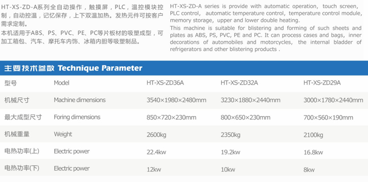 HT-XS-ZD-A series is provide with automatic operation, touch screen,PLC control, automatic temperature control, temperature control module,memory storage, upper and lower double heating.This machine is suitable for blistering and forming of such sheets andplates as ABS, PS, PVC, PE and PC. It can process cases and bags, innerdecorations of automobiles and motorcycles, the internal bladder ofrefrigerators and other blistering products.