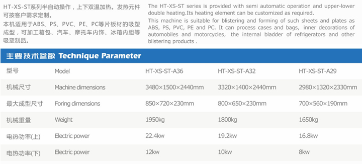 The HT-XS-ST series is provided with semi automatic operation and upper-lowerdouble heating.Its heating element can be customized as required.This machine is suitable for blistering and forming of such sheets and plates asABS, PS, PVC, PE and PC. It can process cases and bags, inner decorations ofautomobiles and motorcycles, the internal bladder of refrigerators and otherblistering products.