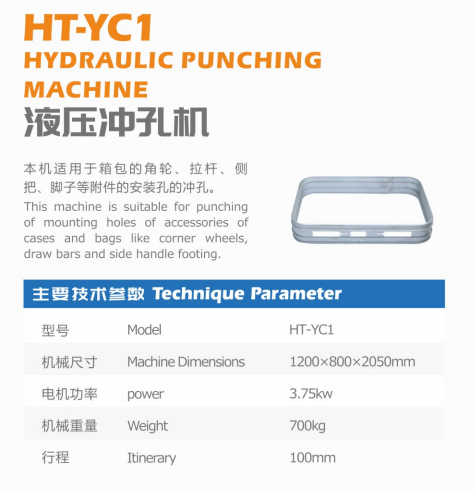 This machine is suitable for punchingof mounting holes of accessories ofcases and bags like corner wheels,draw bars and side handle footing.